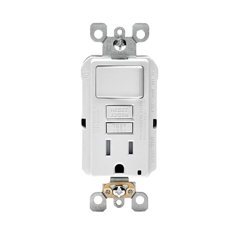 Interruptor de combinación ICFT SmartlockPro delgado. Receptáculo a prueba de manipulaciones con indicador LED. 15 A, 125 V. Interruptor de 1.800 W, 120V CA. Monocromático, cableado posterior y lateral, la placa de pared/placa frontal se vende por separado, clip de puesta a tierra automático incluido – Blanco