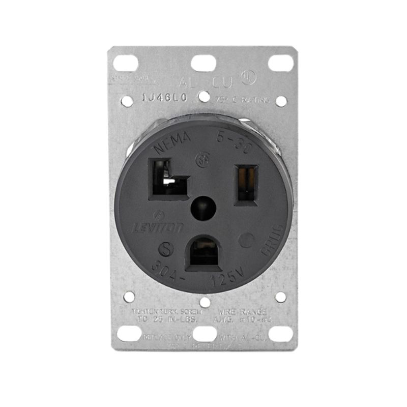 Tomacorriente de montaje empotrado, hoja recta, grado industrial, conexión a tierra, cableado lateral, correa de acero, 30 A, 125 V, NEMA 5-30R, 2P, 3W, negro
